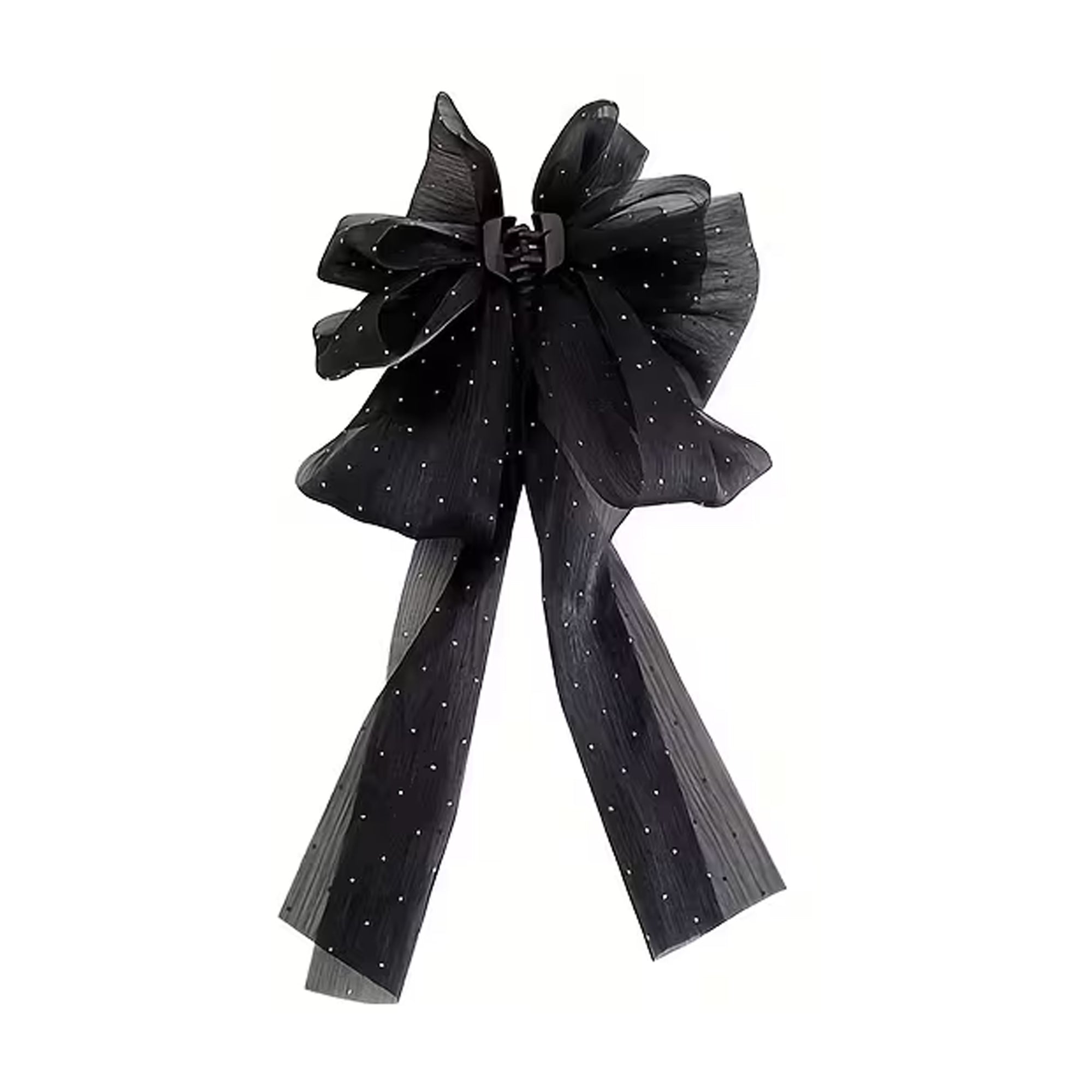 Drama meets elegance with our Streamer Bow Hair Clip. Designed to make a statement, this oversized black bow features soft flowing ribbon streamers and delicate sparkle details that catch the light with every move. The sheer textured fabric creates a layered, romantic silhouette that feels both bold and refined.