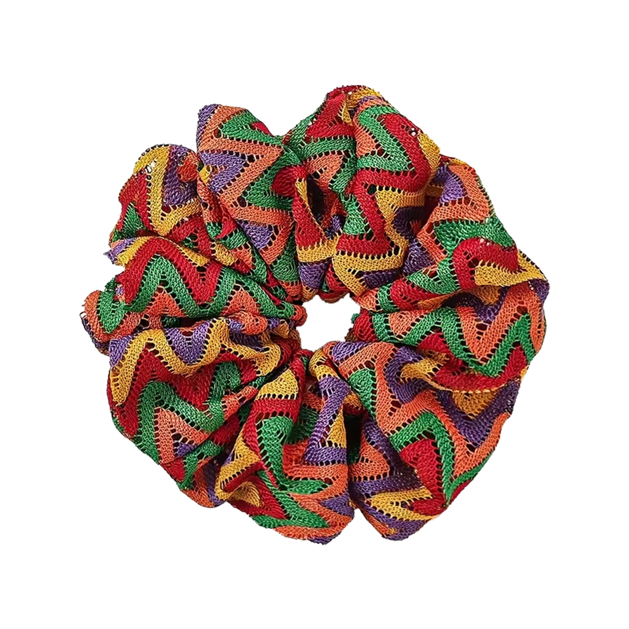 Hair scrunchie featuring a bold zigzag pattern designed to wrap securely around ponytails and buns while adding texture and color.