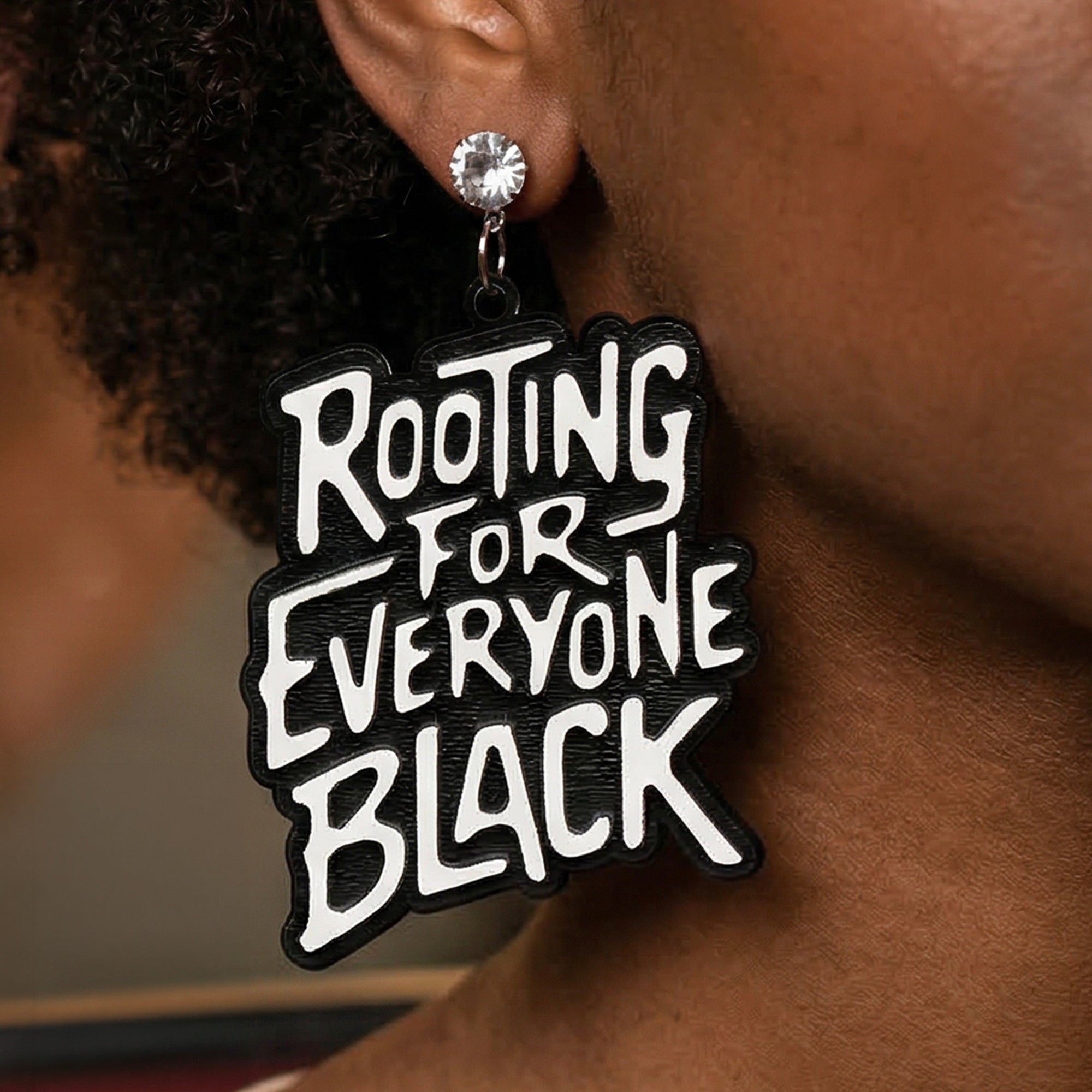 Inspired by Issa Rae’s iconic quote “I’m Rooting For Everyone Black,” these statement earrings are more than an accessory. They are a whole mindset.